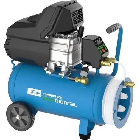 Compresseur lubrifié 1 cylindre à piston, entrainement direct. Idéal pour une utilisation en atelier et garage. Il est équipé de roues en matière plastique pour un transport aisé. La pression de travail et la pression du réservoir sont indiqués de manière visible sur les manomètres.